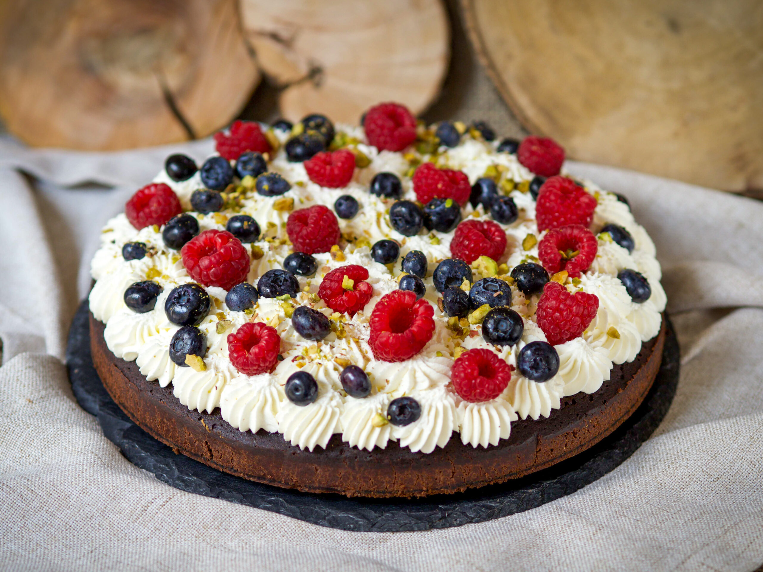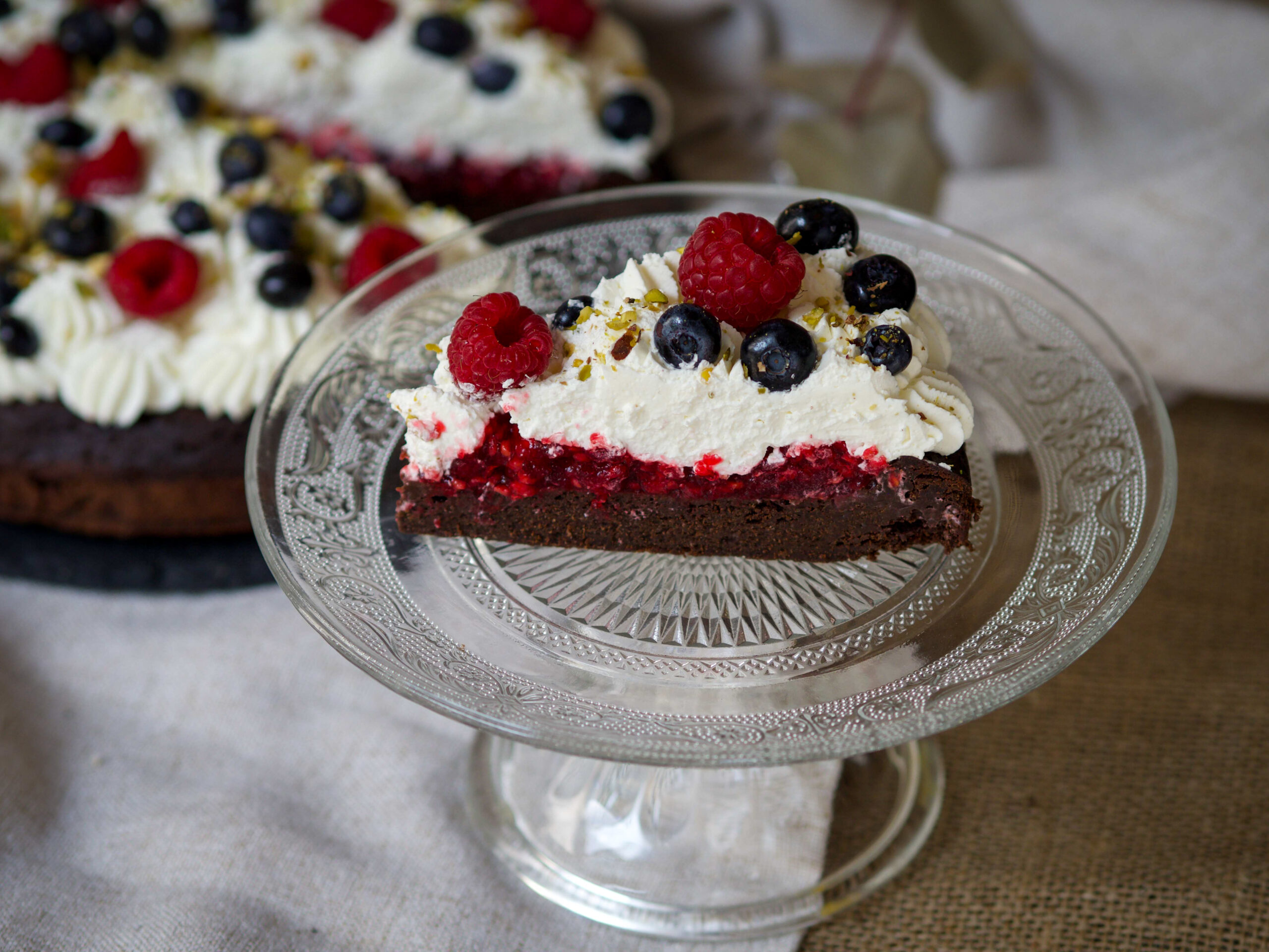 Bezglutenowe brownie z konfiturą malinową, kremem i owocami