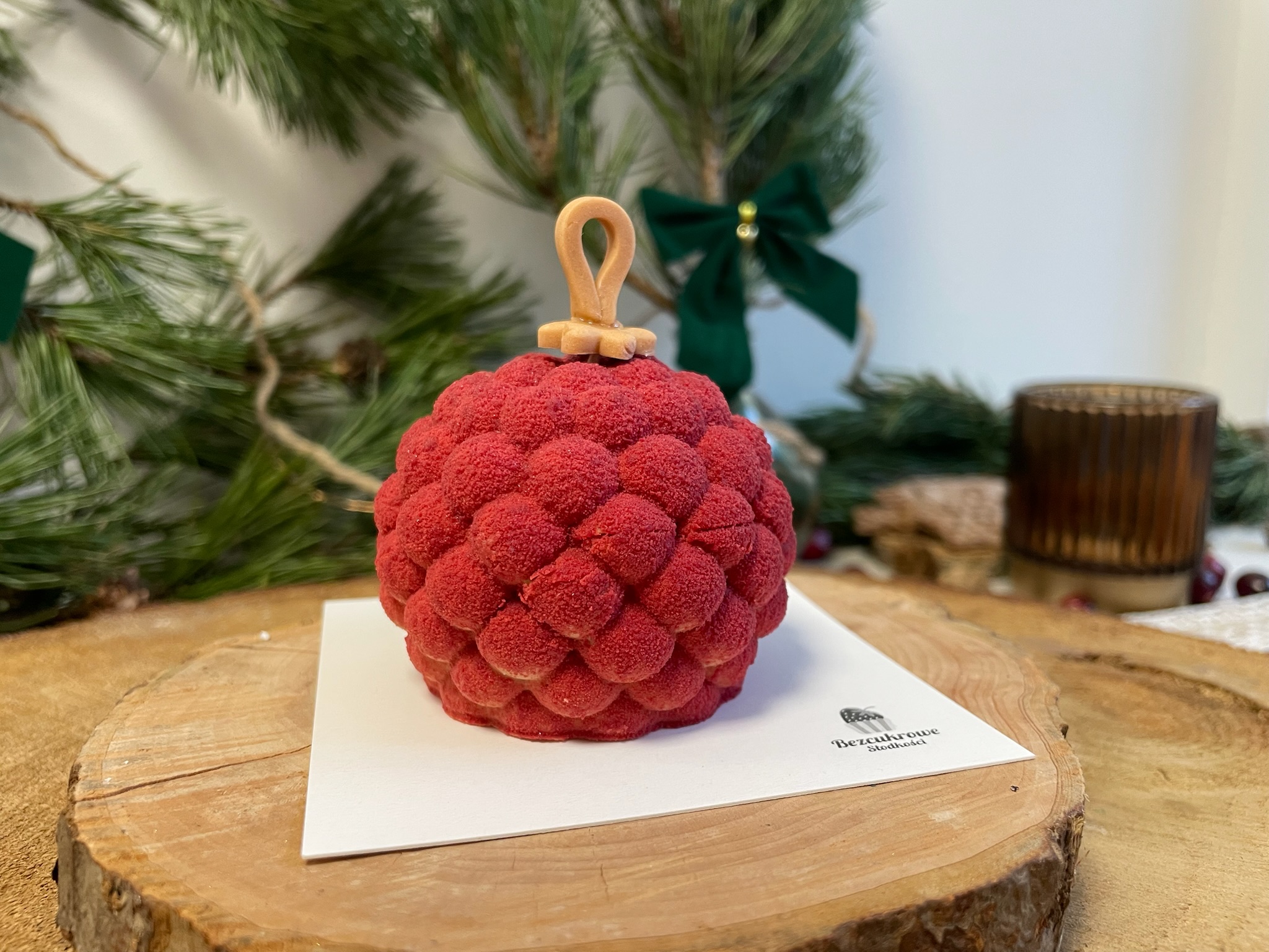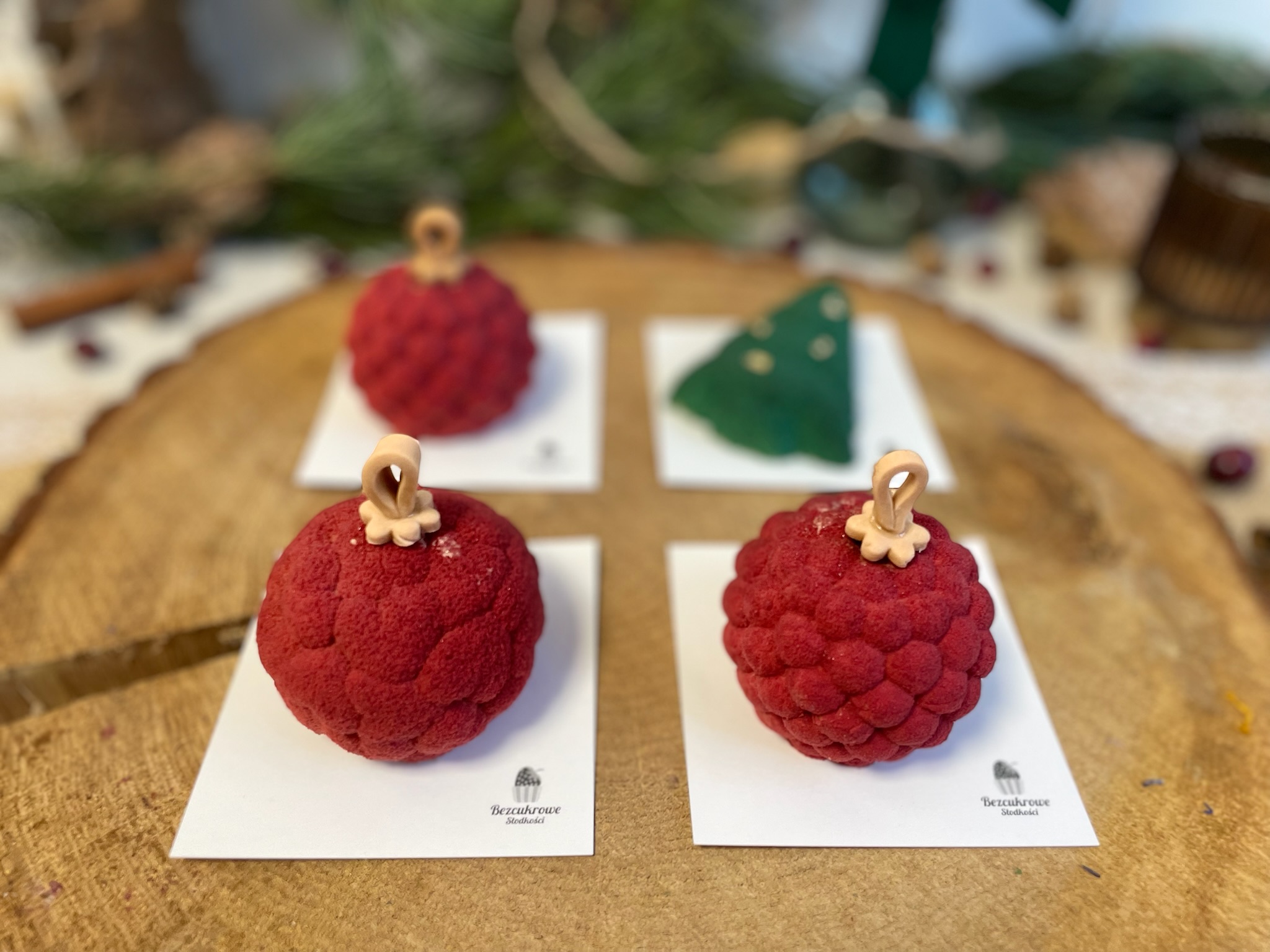 -bombka: mus czekoladowo-piernikowy/ żelka wiśniowa/ pralina orzechowa